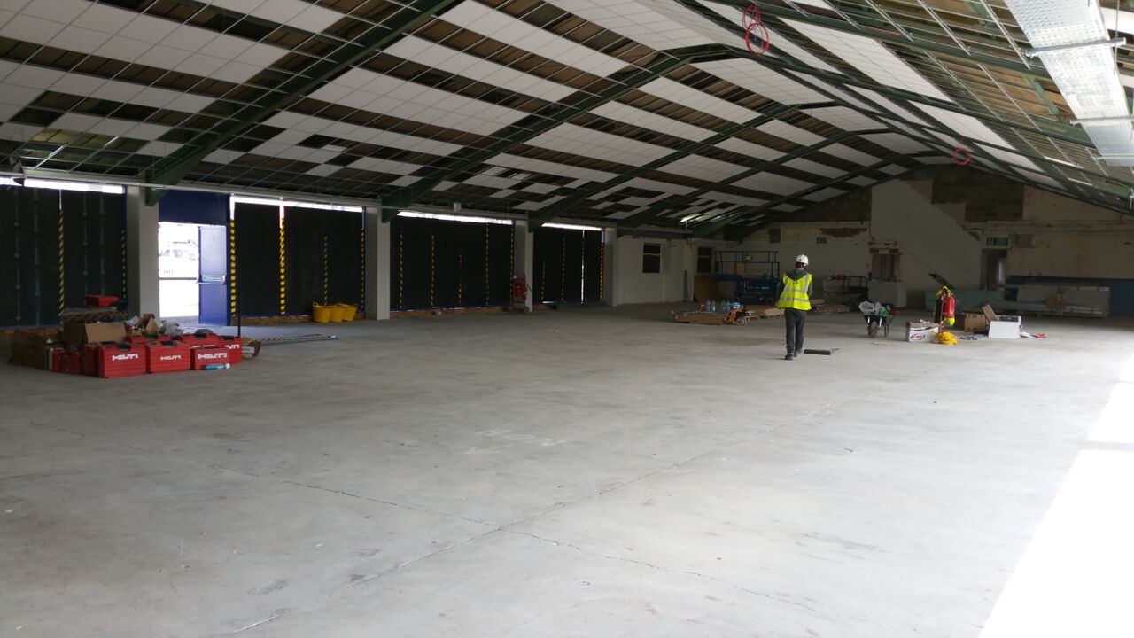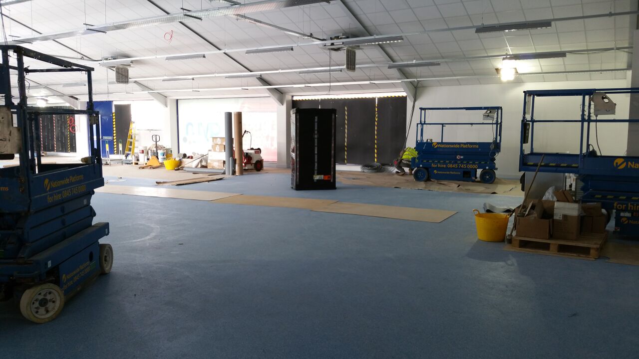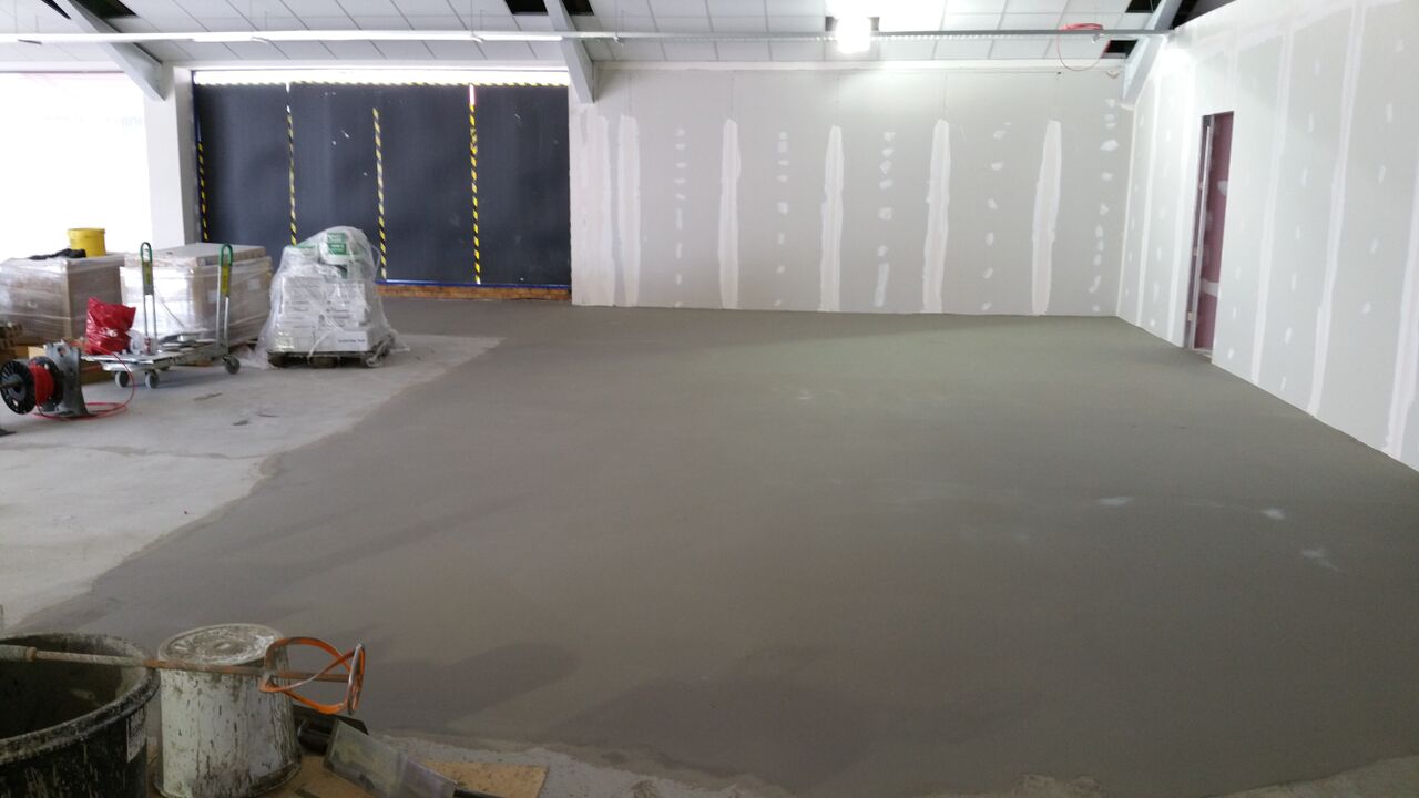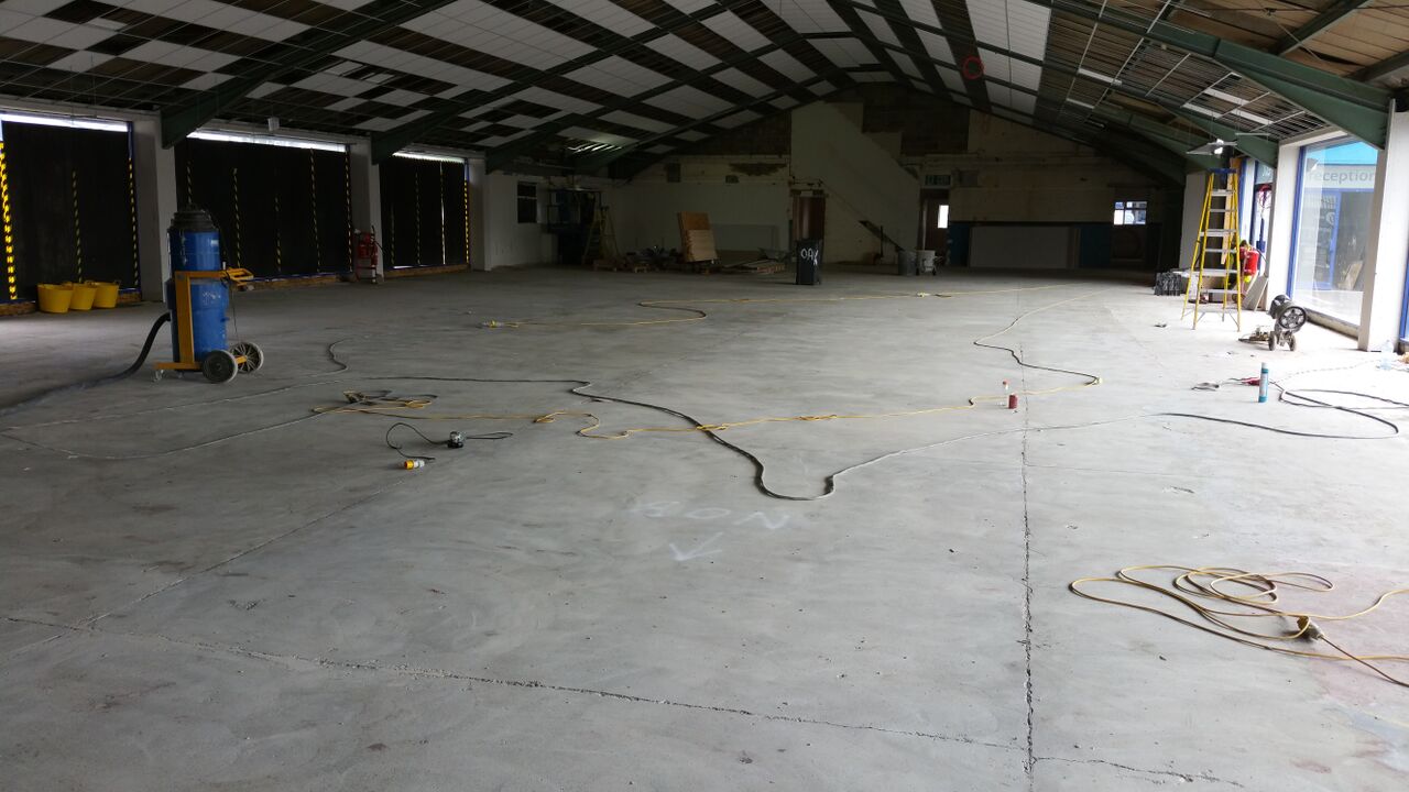 The Gym, Potsmouth- As the building was previously a car dealership, the floor was ground off with diamond tooling, and a smoothing compound applied.